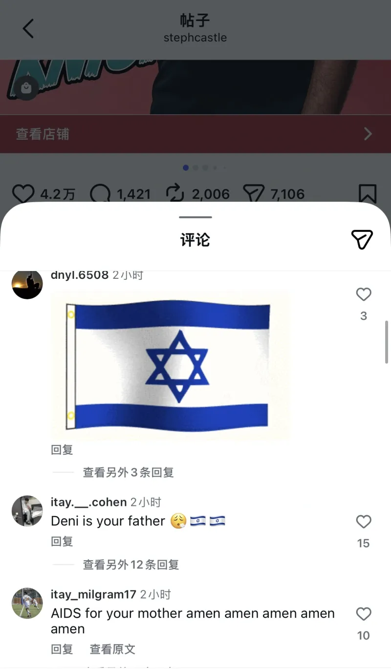 赛后,卡斯尔的ins评论区被以色列球迷攻占,大量以色列球迷在其评论区发表恶意评论,其中包括: